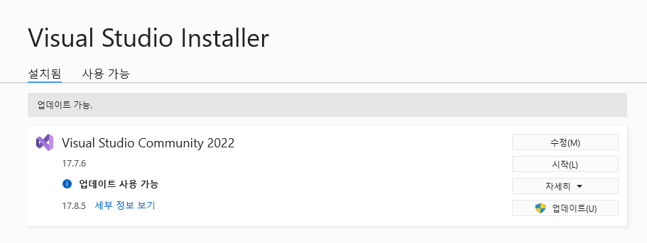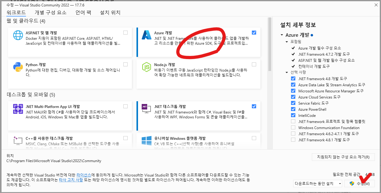 Visual Studio가 이미 설치되어 있더라도, Visual Studio Installer를 실행해서 [수정]을 누른 후 다음 화면에서 [Azure 개발]을 체크해서 설치한다.