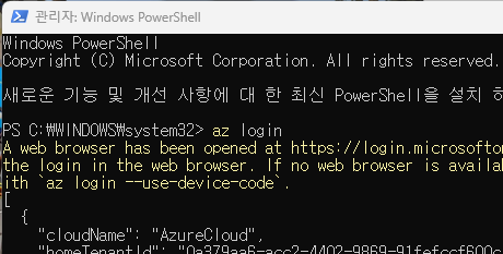 Windows PowerShell을 관리자 권한으로 열고, az login을 입력하면 웹 페이지가 뜬다. PowerShell 창에는 내 정보가 뜬다.