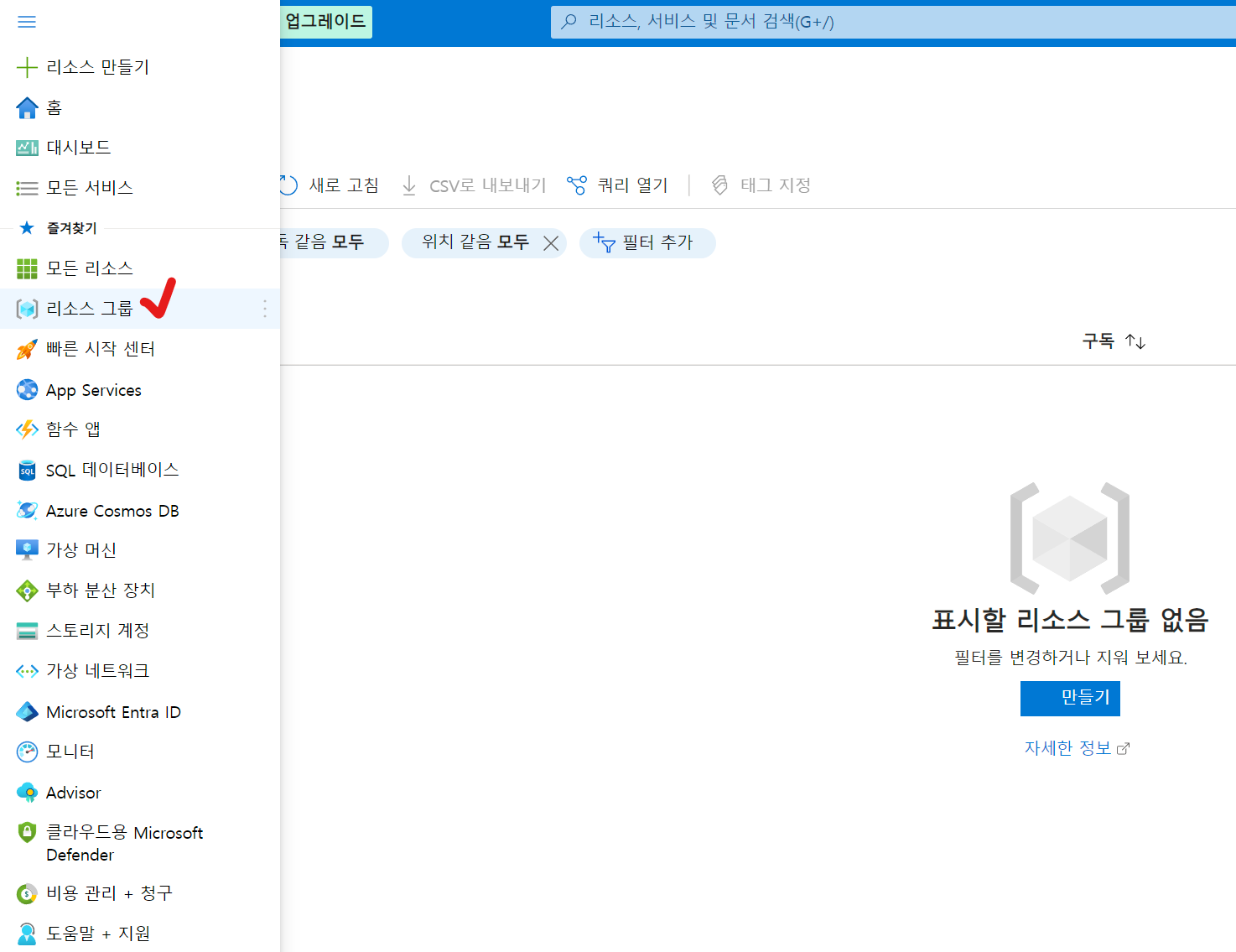 리소스 그룹을 만들었고, 여기에 우리가 리소스를 추가해서 사용할 예정이다.