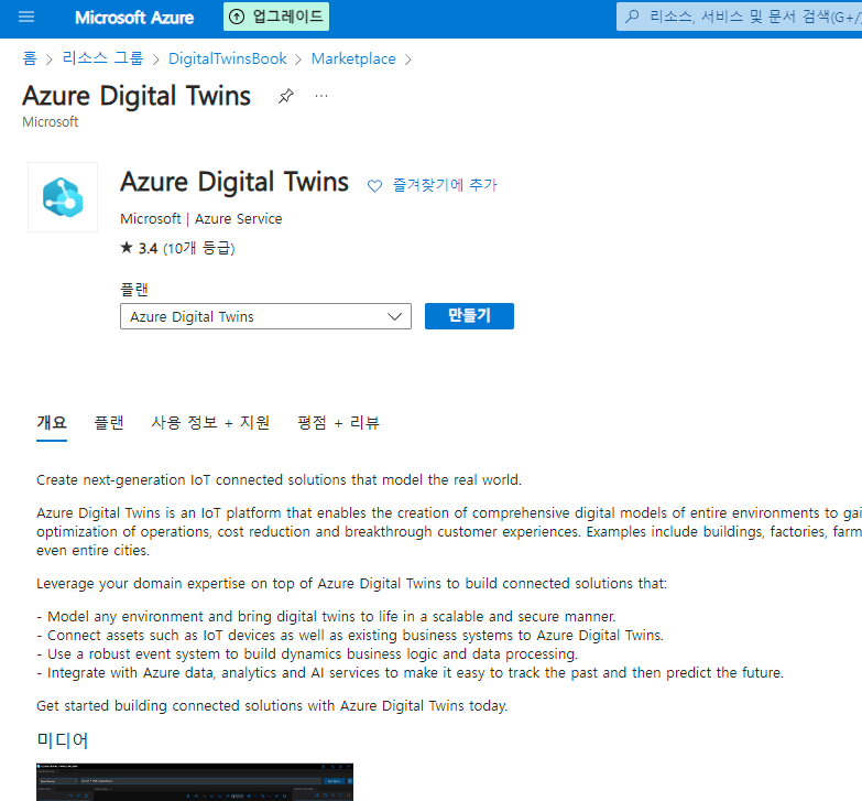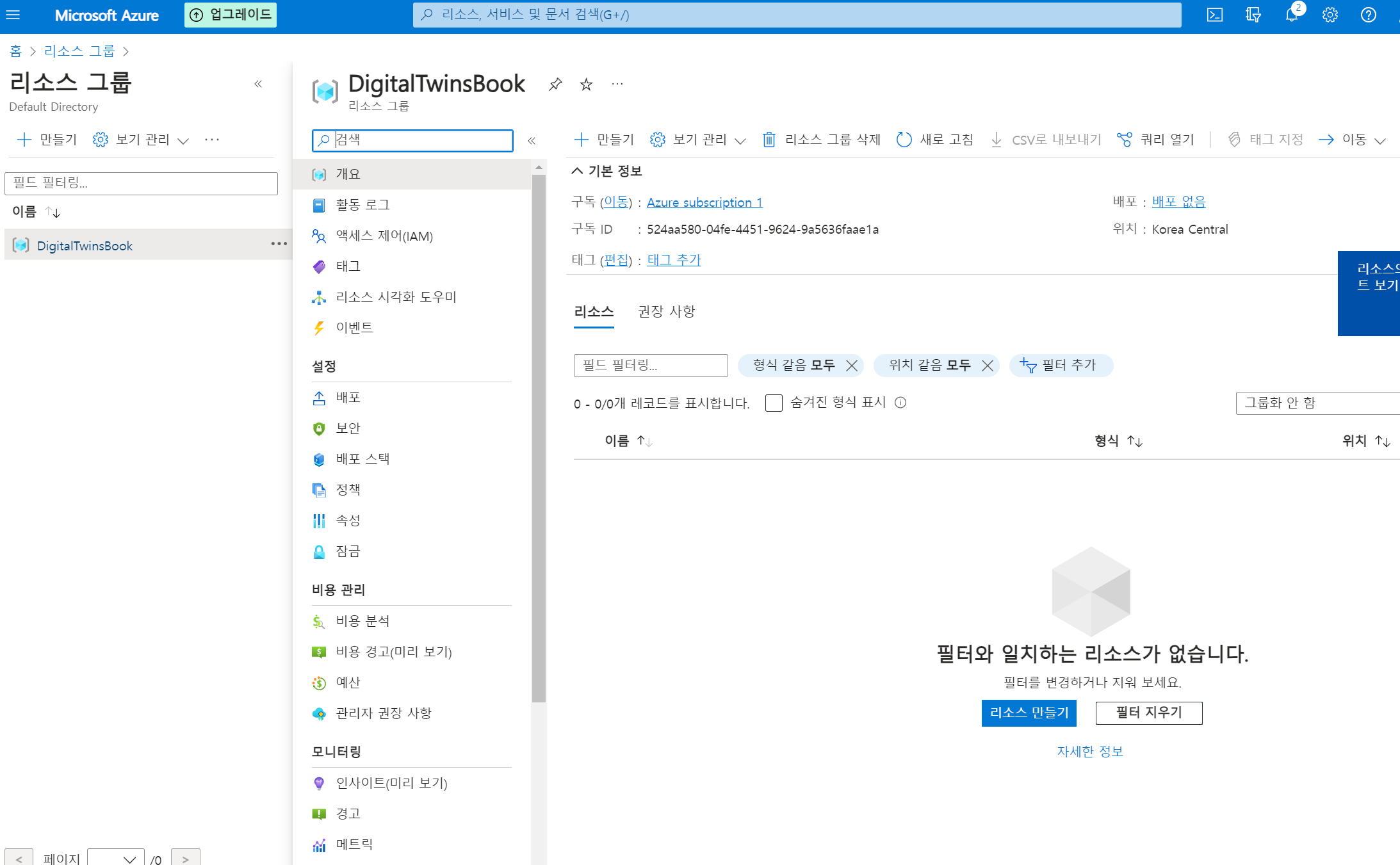 만들어진 DigitalTwinsBook 리소스 그룹을 클릭하면 아래의 화면이 나온다.