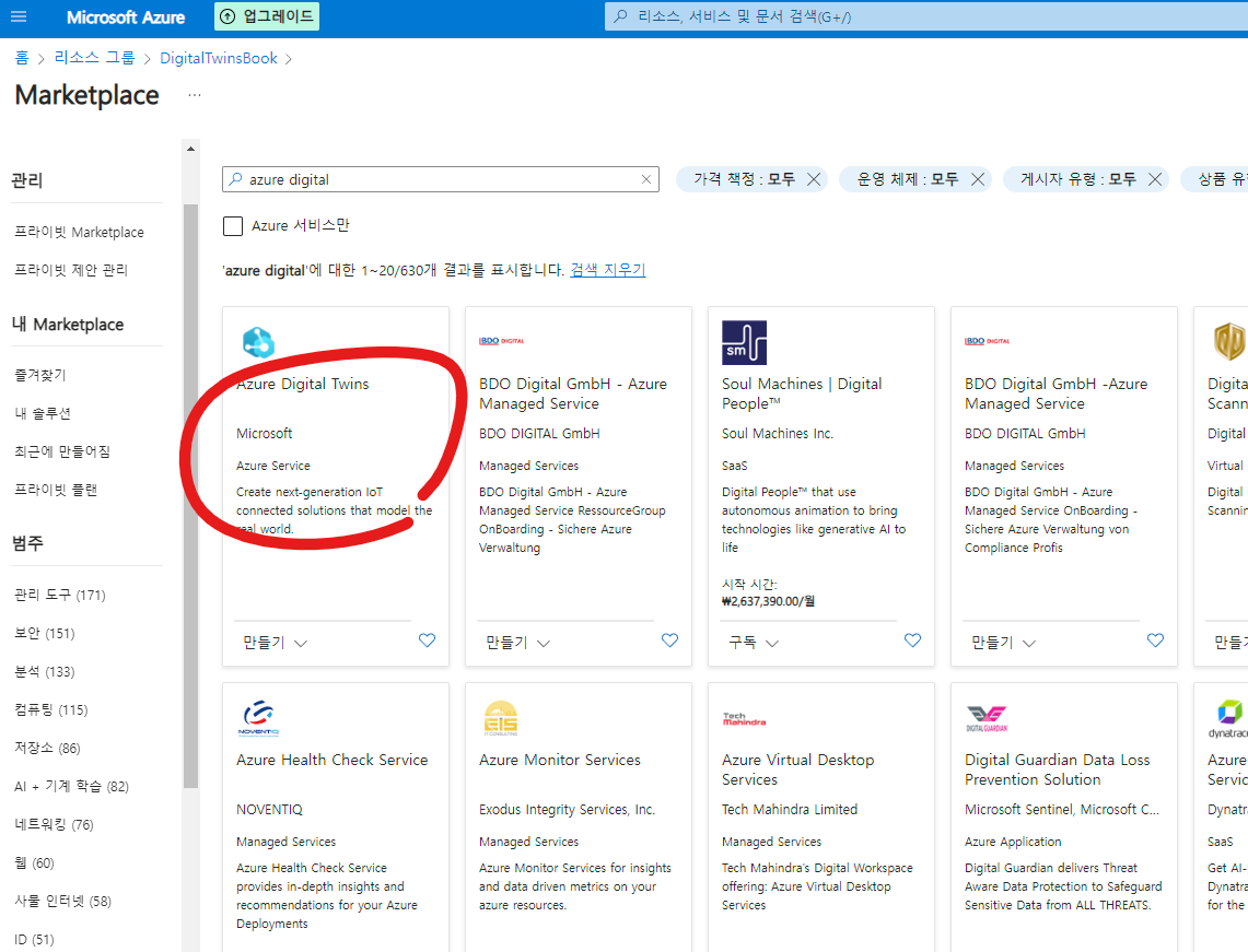 검색창에 Azure Digital을 검색하면, Azure Digital Twins가 뜨며, 클릭하고 [만들기]