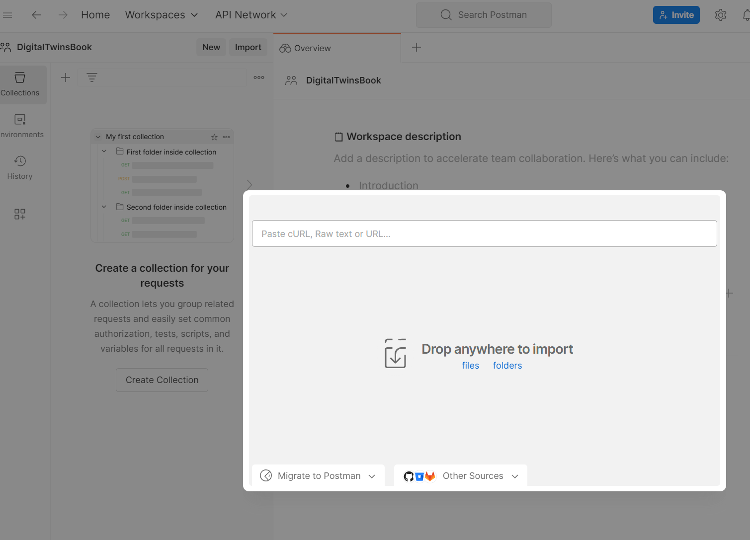 이후 Postman을 열고 [New] 버튼으로 새 Workspace를 만들고, [Import]로 위에서 받은 json 파일을 드래그 앤 드랍 한다.