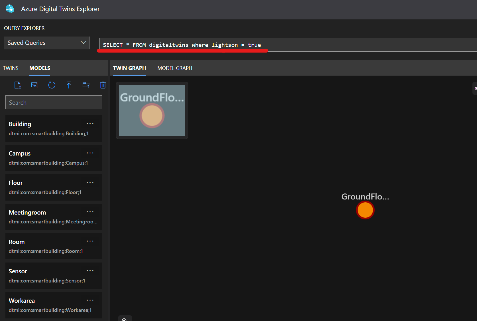 Floor에 [Create a Twin]으로 GroundFloor를 하나 만들면, 위의 코드를 실행했을 때 floornumber와 lightson의 정보가 들어가게 된다. 그리고 chapter5안에 floor.json도 있어야 한다.