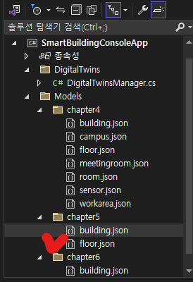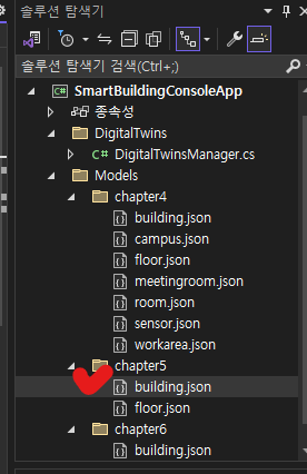 Program.cs 스크립트에서 이전 building.json 모델 지우고 chapter5에 넣은 새로운 building.json으로 create한다. 성공적으로 되었다면 Model updated가 출력된다.