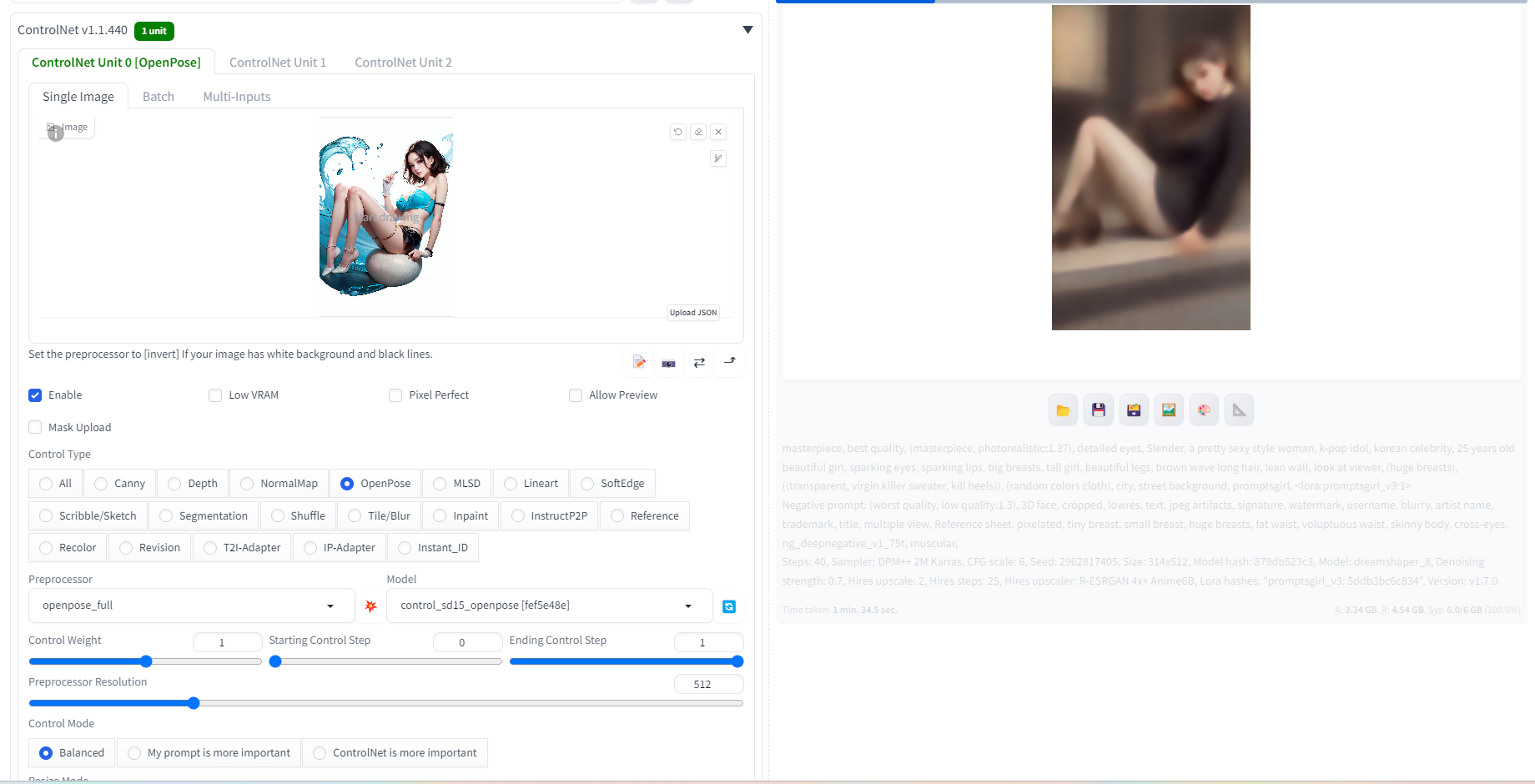 [OpenPose]를 선택한 후 캐릭터가 했으면 하는 자세의 이미지를 끌어다 놓고 생성하면 이미지대로 자세를 취한 결과물이 나온다.