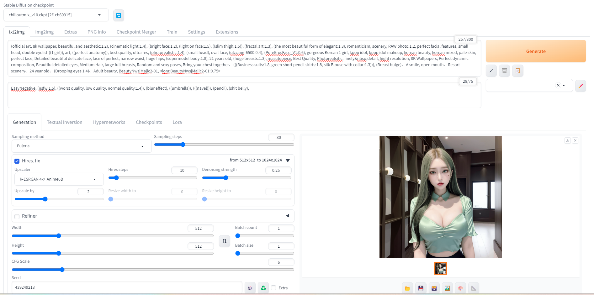 완전히 같은 프롬프트와 값을 주었고 모델만 바뀌었다. 배경 분위기는 거의 비슷하고 캐릭터에 대한 실사화 느낌이 달라졌다.