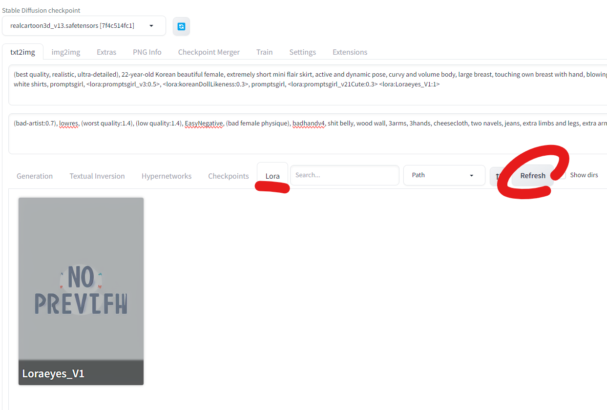 Stable Diffusion 페이지로 가서 Lora 탭에서 Refresh를 한 후 다운 받았던 모델을 눌러 적용하면 된다. 그러면 프롬프트 아래에 lora에 대한 프롬프트가 생성된다.