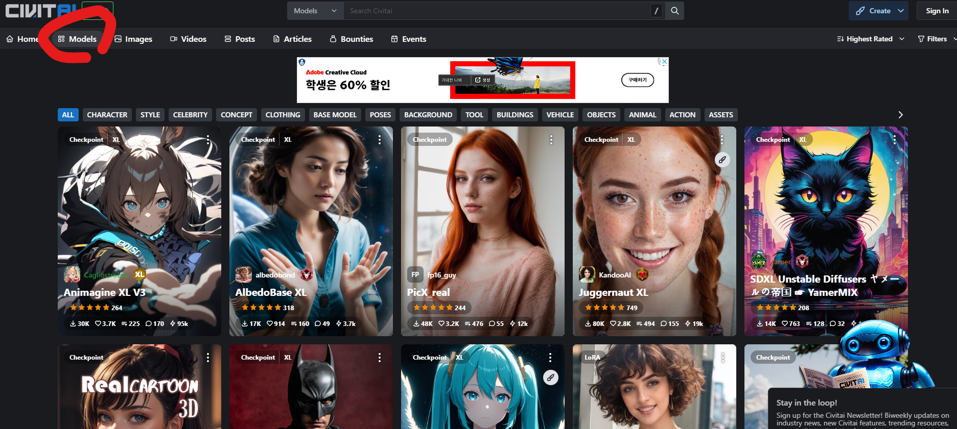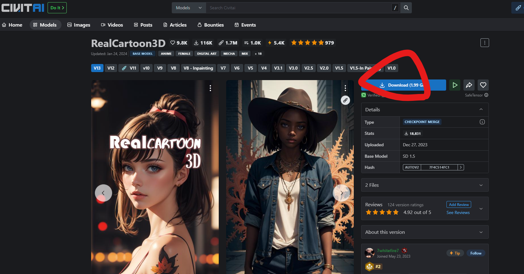 상단의 Models 탭에 들어가서 Checkpoint라고 쓰여있는 모델들로부터 모델을 다운로드 받는다.
