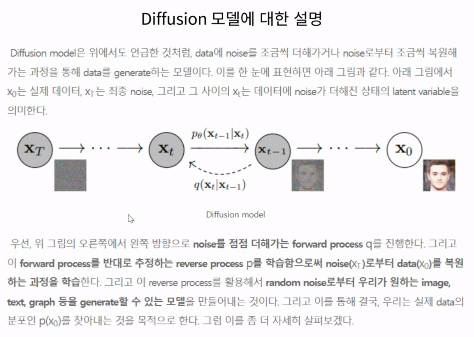 Diffusion 방식은 노이즈에서 시작하여 점점 또렷하게 보여지게 하는 방식이다.