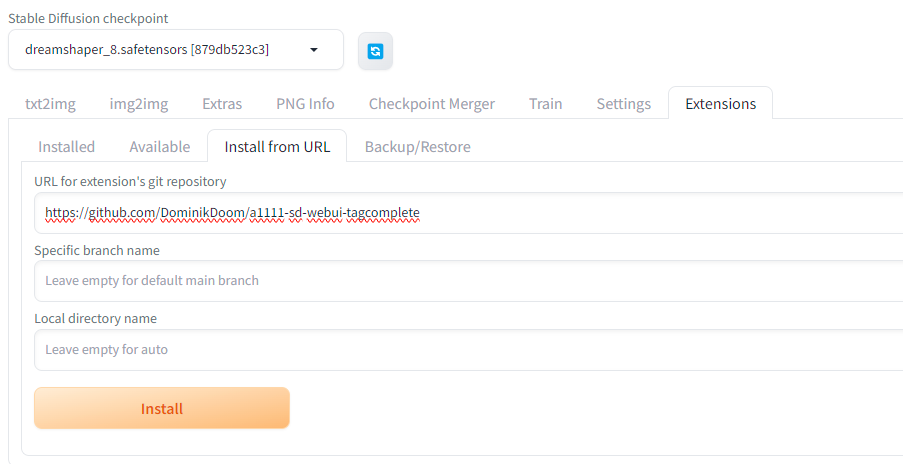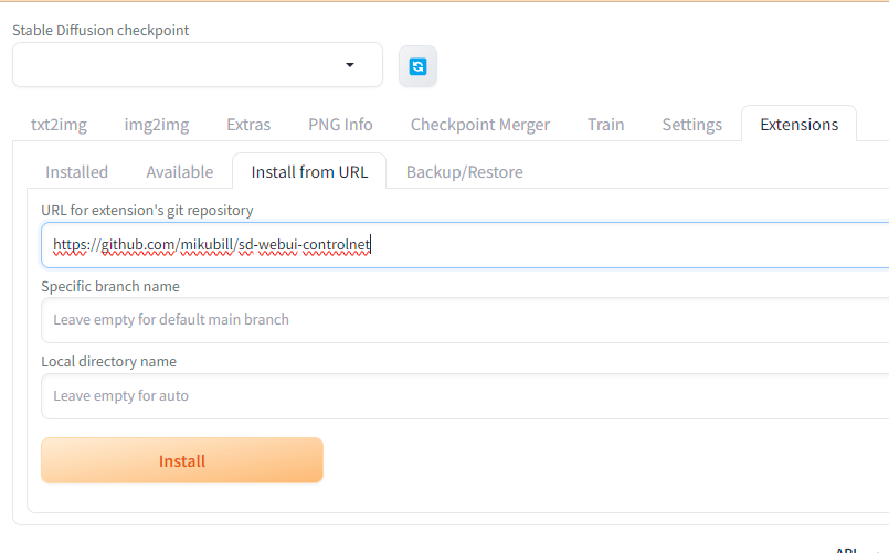 위의 링크를 Stable Diffusion의 Extentions에 붙여넣는다.