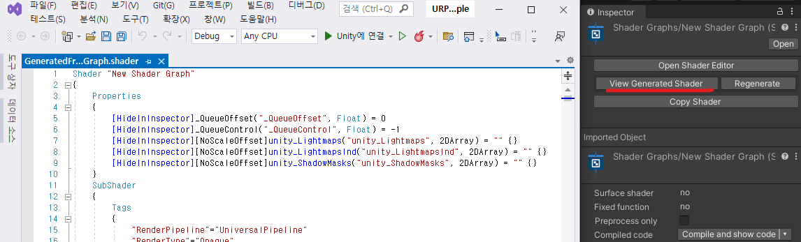 셰이더 그래프 [Inspector] 창에서 [View Generated Shader]를 누르면 비주얼 스튜디오에서 코드를 볼 수 있다.