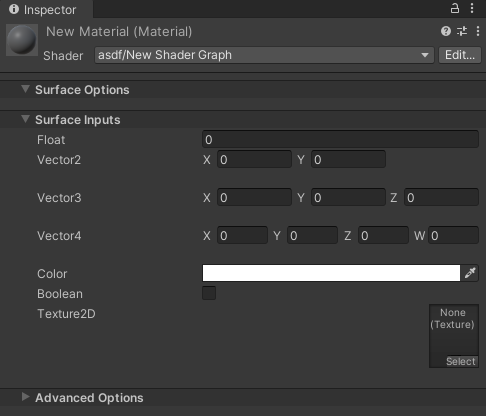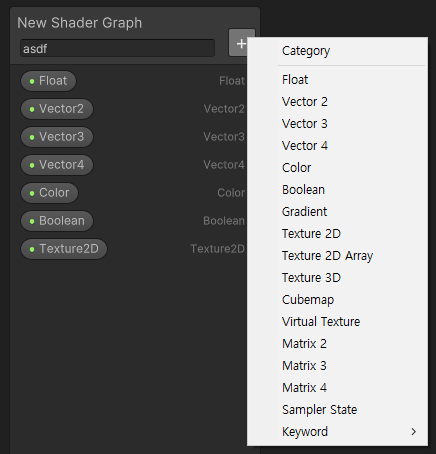다양한 Property들을 추가할 수 있으며, 추가하면 재질 Inspector에서 해당 변수를 수정할 수 있다.
