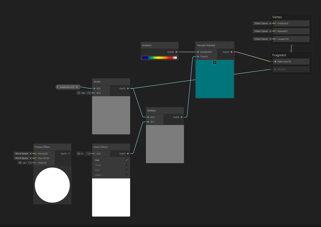 셰이더를 하나 만들어서 메테리얼에 적용한다. (Fresnel Effect는 시점에 따라 달라지기 때문에 뺐다.)