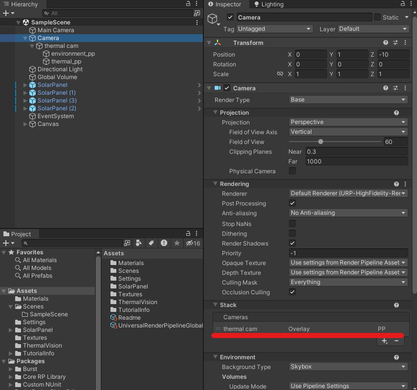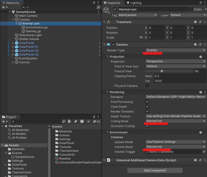 thermal cam 이름을 가진 카메라는 Render Type을 [Overlay]로, Culling Mask와 Volume Mask는 [thermal hot] 레이어로 설정한다.