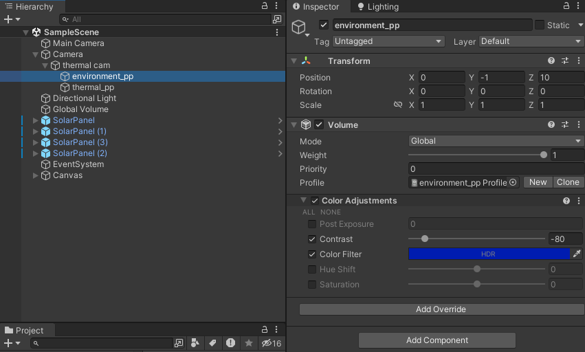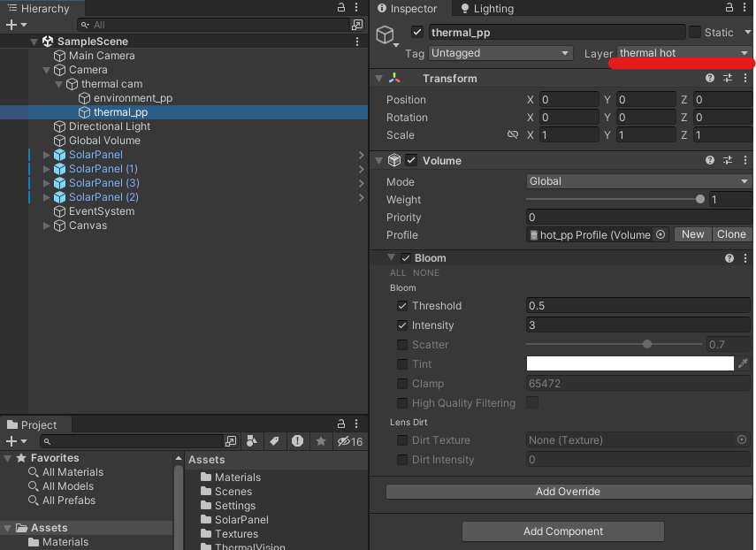 environment_pp와 thermal_pp라는 이름의 [Volume] 컴포넌트를 가진 PostProcessing을 두 개 만들고 thermal_pp에는 [thermal hot] layer를 적용한다.