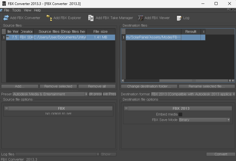 변환이 필요한 fbx 파일을 왼쪽에 끌어다 놓고 Binary 설정을 한 후 Convert만 하면 된다.