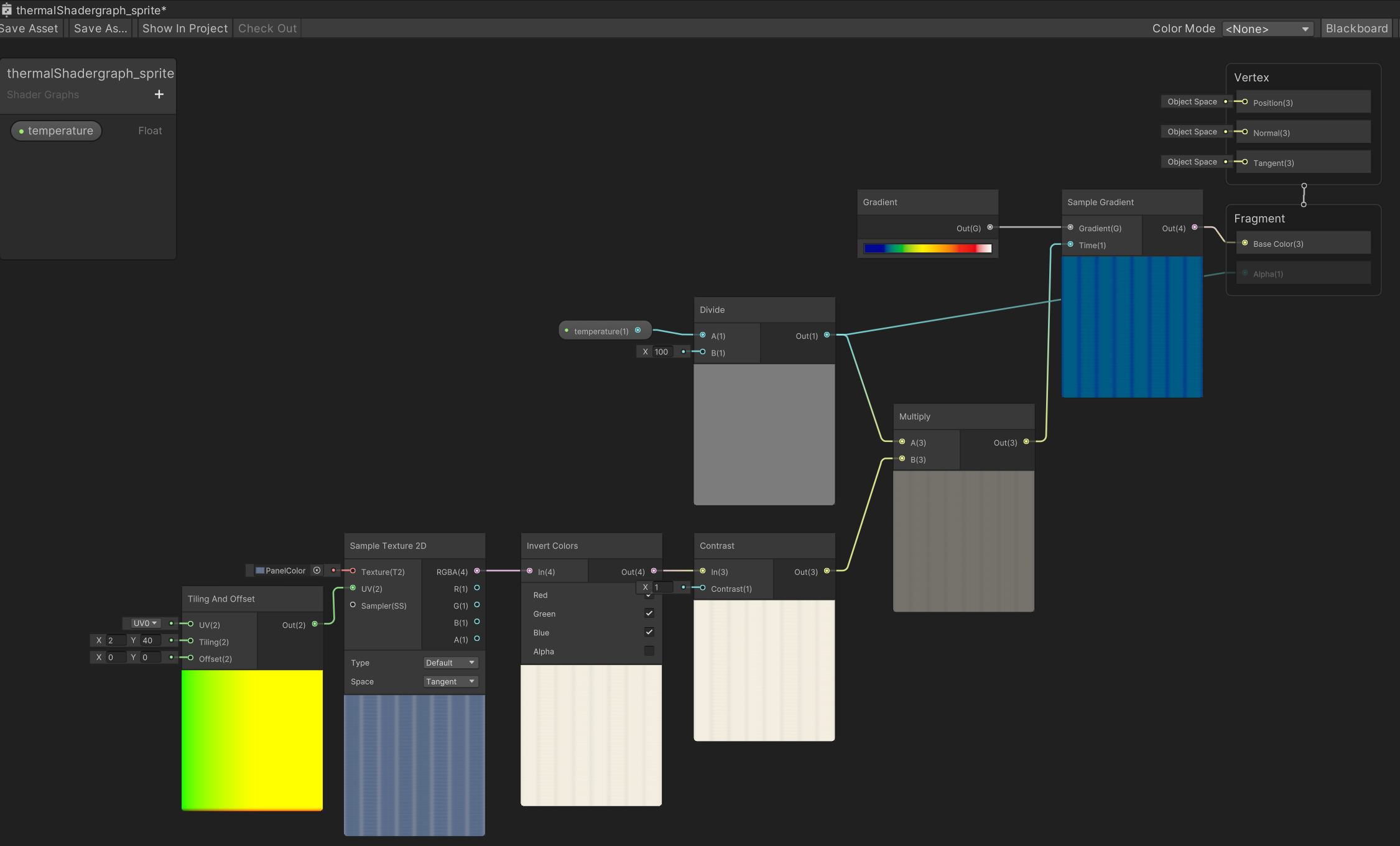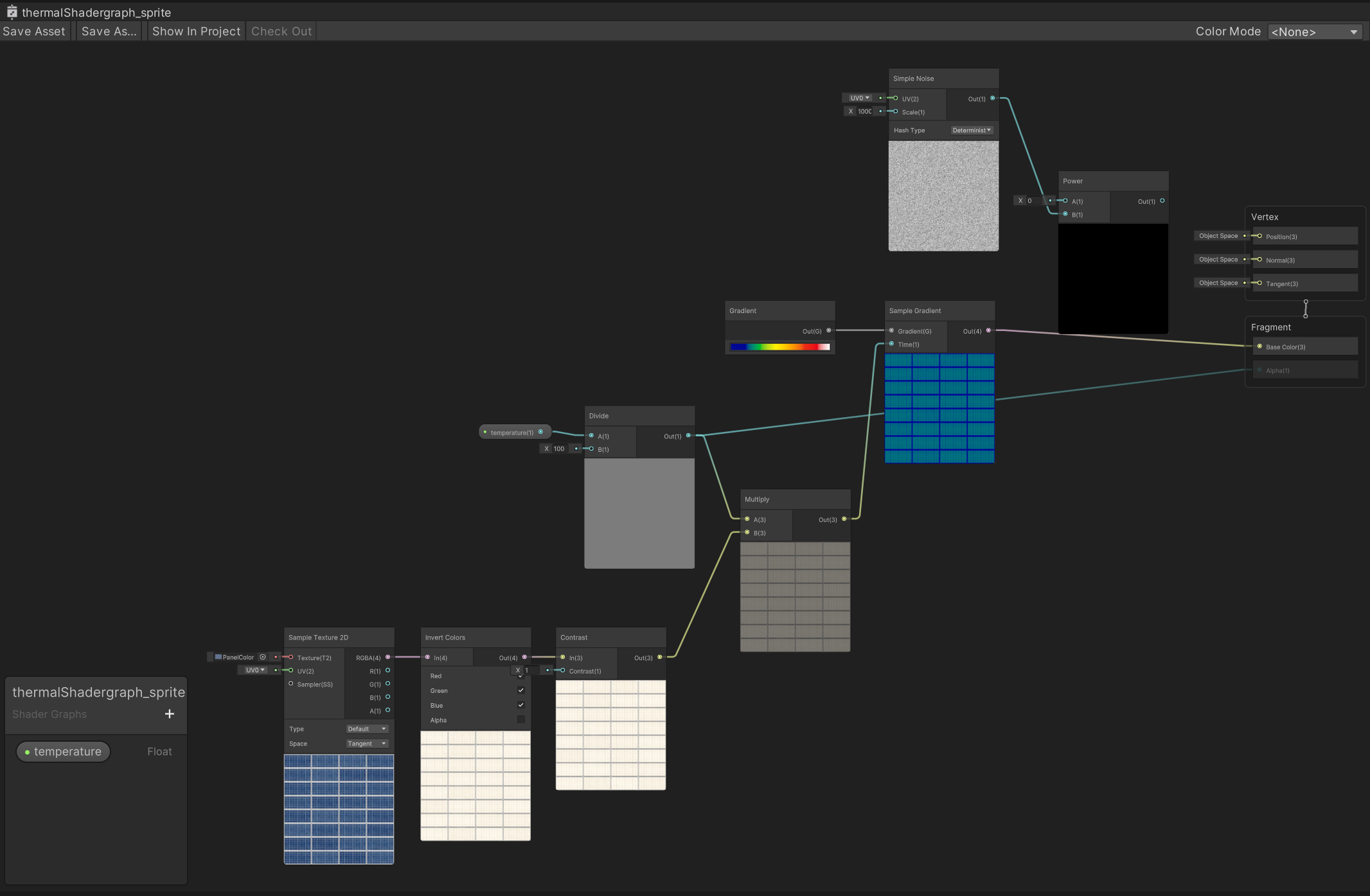 이렇게 하는 이유는 내가 높은 온도를 내고 싶은 부분은 밝게, 낮은 온도를 표시하고 싶은 부분은 어둡게 칠해서 대비를 주는 것이다. 내가 가지고 있는 원래 텍스쳐를 셰이더에서 이용해서 이 원리를 적용해도 될 것 같았다. 가령 Contrast로 밝고 어두운 대비를 준다던지...