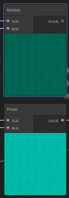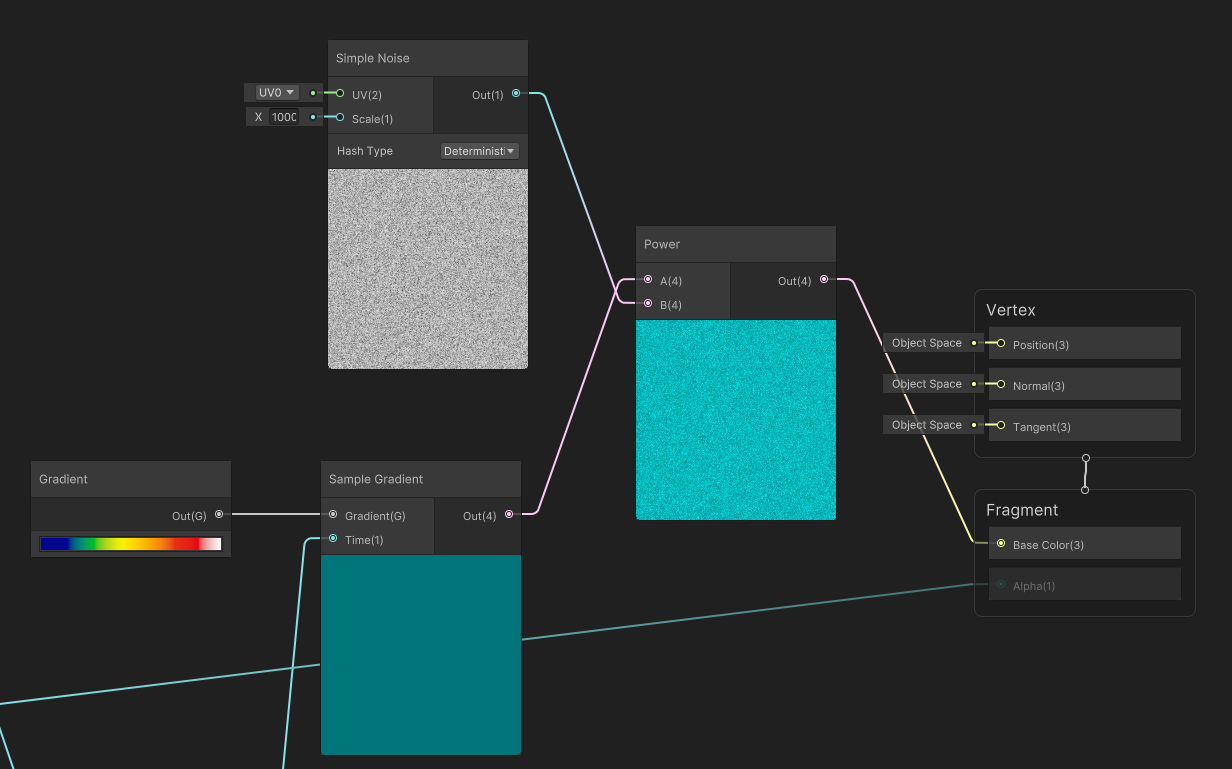 [Simple Noise] 노드를 [Clamp]에 연결한 후 0.5~0.6의 값을 주었고, 마지막에 [Power] 노드로 텍스쳐와 연결했다. [Power]노드를 쓴 이유는 더 밝고 원한는 색이 나와서이고, [Multiply]를 썼을 때는 생각보다 더 어두운 색이 나왔다.