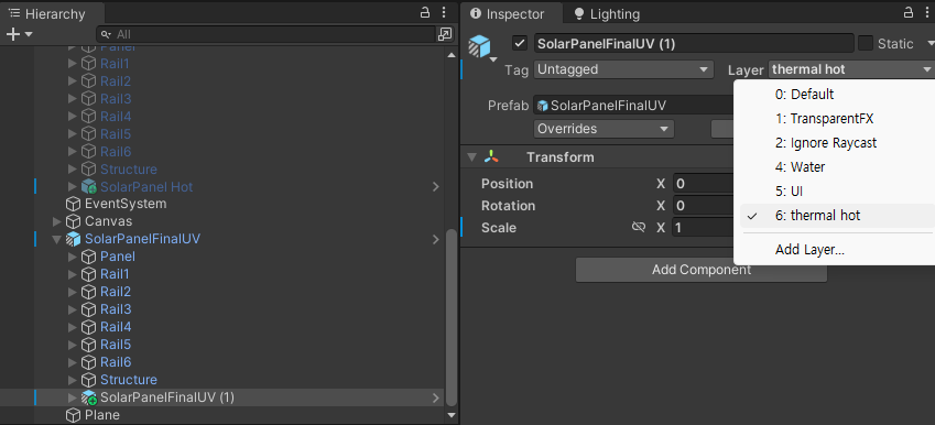 내부 프리팹의 Layer를 'thermal hot'으로 설정한다.