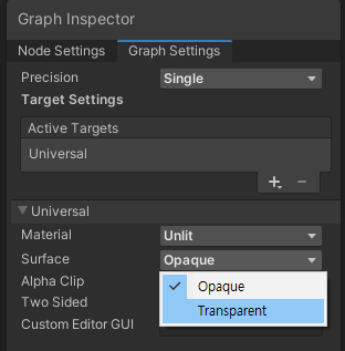 지금까지 불투명한 Opaque 셰이더를 했고 이제는 Transparent 셰이더를 만들어 본다. [Graph Inspector]에서 [Surface]를 [Transparent]로 바꾼다.