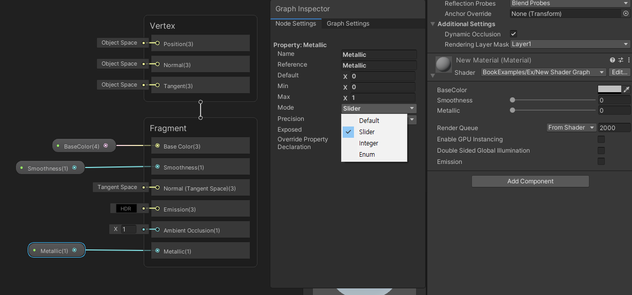 float 프로퍼티를 추가하고 각각 Smoothness, Metallic으로 [Slide] 모드를 적용하면 슬라이드로 원하는 값을 넣을 수 있게 된다.