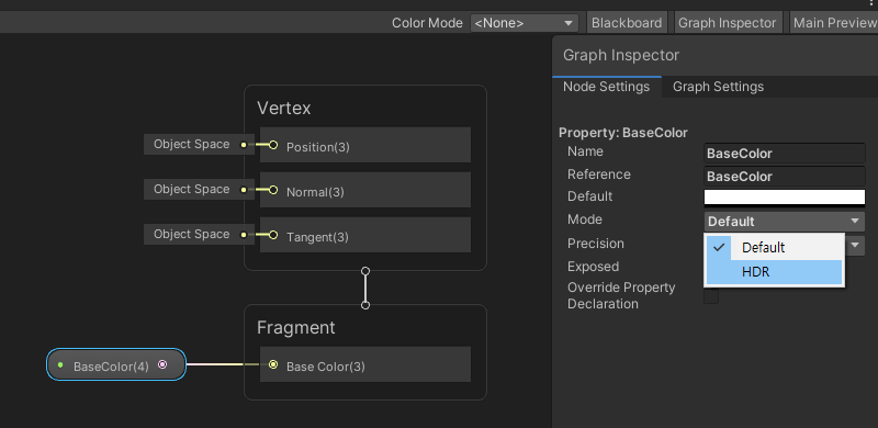 Unlit Shader Graph에서 BaseColor 프로퍼티를 하나 만든 후 [Mode]를 [HDR]로 바꾼다.