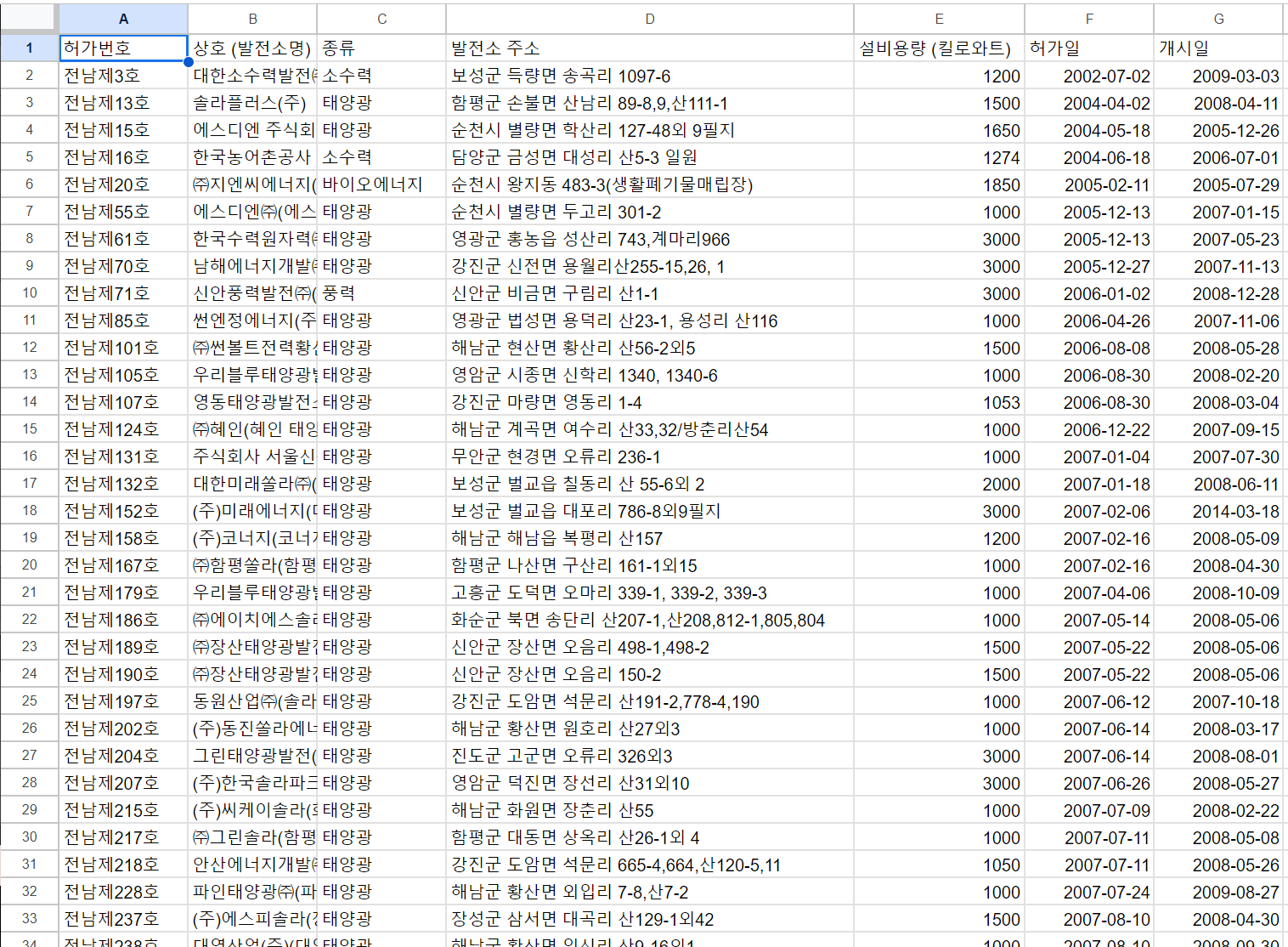 전라남도내 신재생에너지 발전 상업운전 현황<br/>태양광, 풍력, 소수력, 바이오에너지 등<br/>발전소명, 발전소위치, 사업허가일, 사업개시일, 발전용량 등