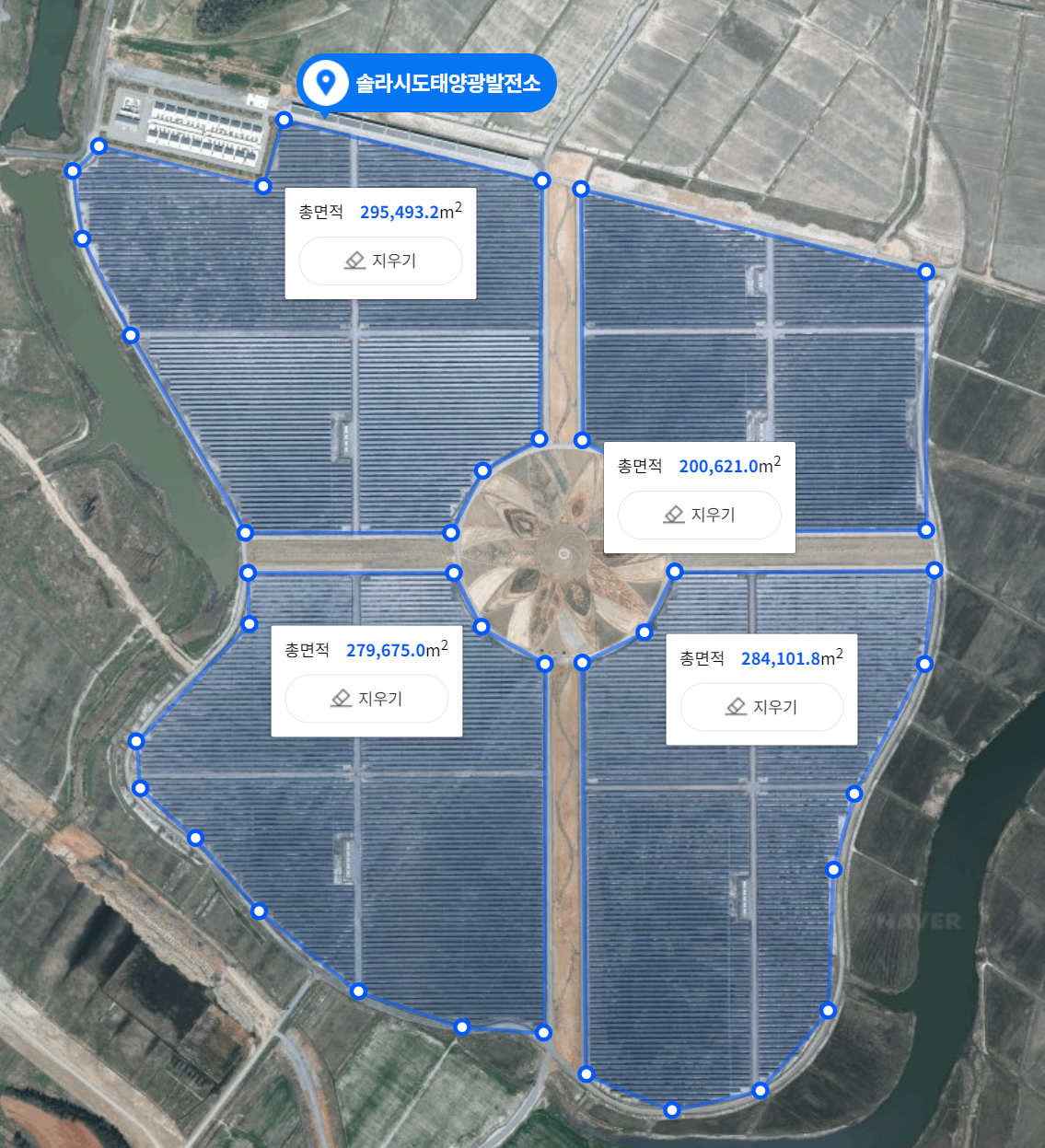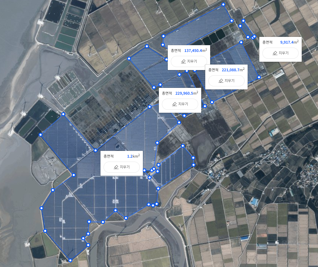 발전 면적은 네이버 지도의 면적 구하는 툴로 계산하였다.