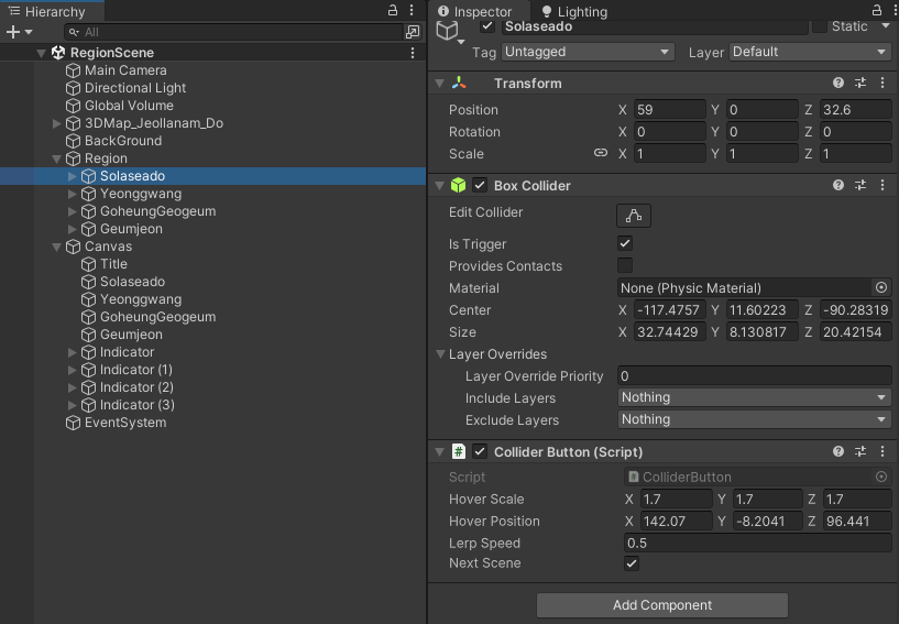 마우스를 올리면 에셋 스케일을 Coroutine을 이용해 천천히 변경하기, 솔라시도 부분 에셋을 누르면 다음 씬으로 넘어가기