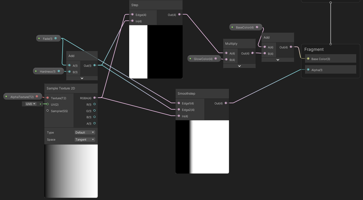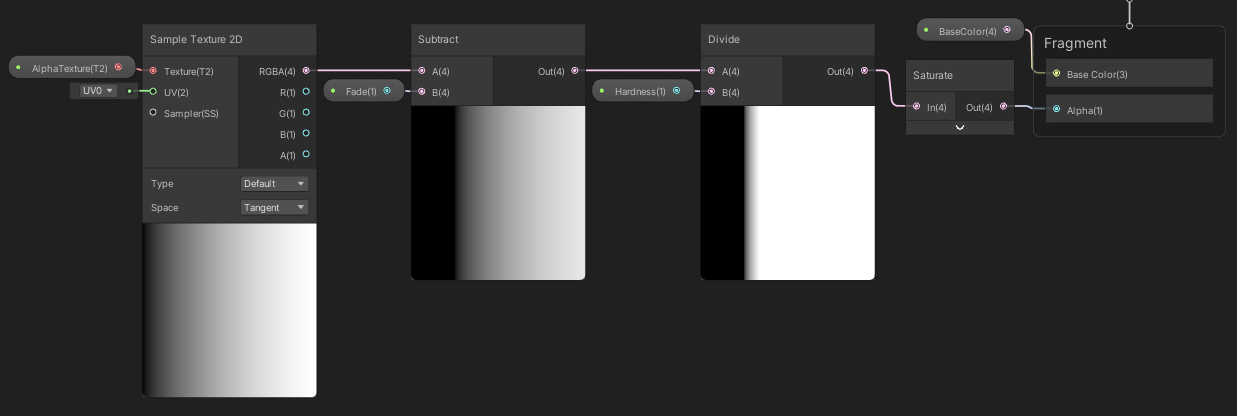 Fade 값을 [Subtract]에 놓고 원하는 Fade 값 만큼값만큼 숫자를 빼준다. 이후 [Divide]에서 Hardness 값만큼 기울기를 나눠 줌으로써 Hardness 값이 작으면 기울기가 치솟아서 강렬하고 선명한 텍스쳐가 되고, Hardness 값이 높다면 기울기가 작아짐으로써 텍스쳐가 퍼져 보이게 된다. 마지막에 [Saturate]으로 0 이하는 0으로, 1 이상은 1로 평탄화해주면 된다. Alpha 값이 마이너스이면 이상하게 보이기 때문이다.