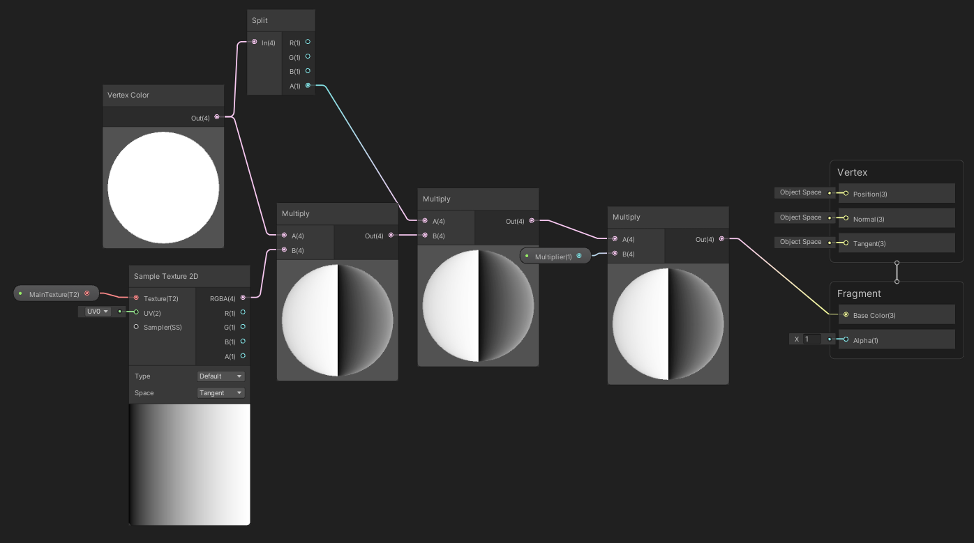 첫 번째 [Multiply]에서 파티클 시스템은 [Vertex Color]로 부터 입력을 받는다. 두 번째 [Multiply]에서는 [Vertex Color]의 Alpha 값을 한 번 더 곱했다. 파티클에서 파티클의 등장과 소멸에 관여하는 [Color over Lifetime]은 Vertex Alpha에 의해서 제어가 된다. 파티클에서는 따로 HDR을 사용하지 않기 때문에 Multiplier로 세기를 조절한다.