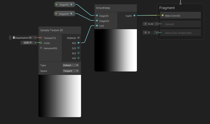 Edge1과 Edge2는 각각 값을 가지며 해당 두 부분 사이를 부드럽게 표현하는 것이 [Smoothstep] 노드이다.