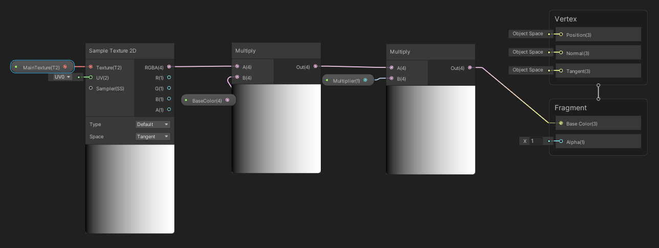 텍스쳐를 하나 불러오고 베이스 컬러와 [Multiply] 한 후 "Multiplier"로 세기를 조절하는 셰이더이다.