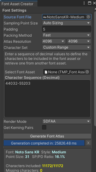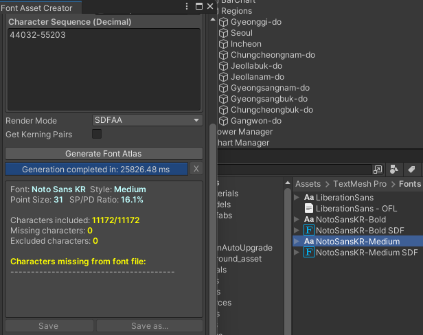 타이틀 그림자, 발전량 표시 등 TextMeshPro에 한글을 쓰기 위해서는 한글 폰트가 필요하다.