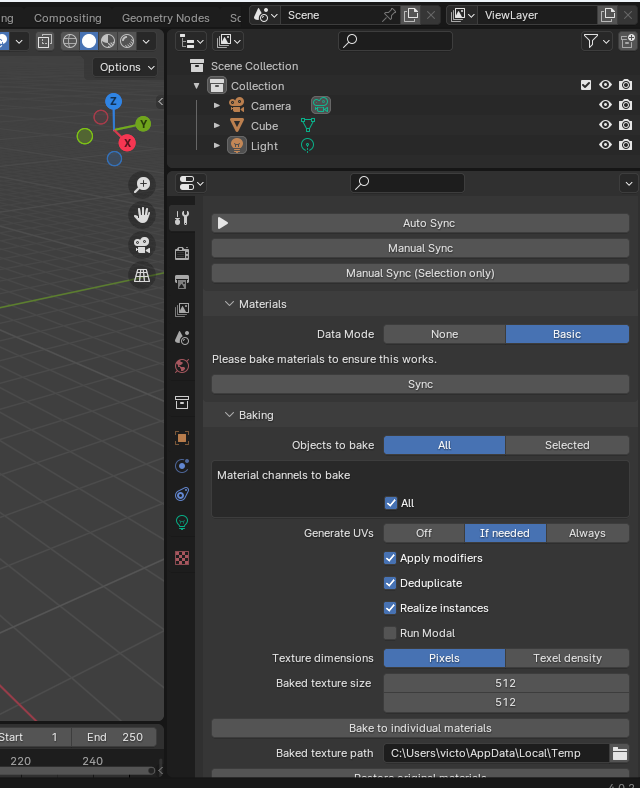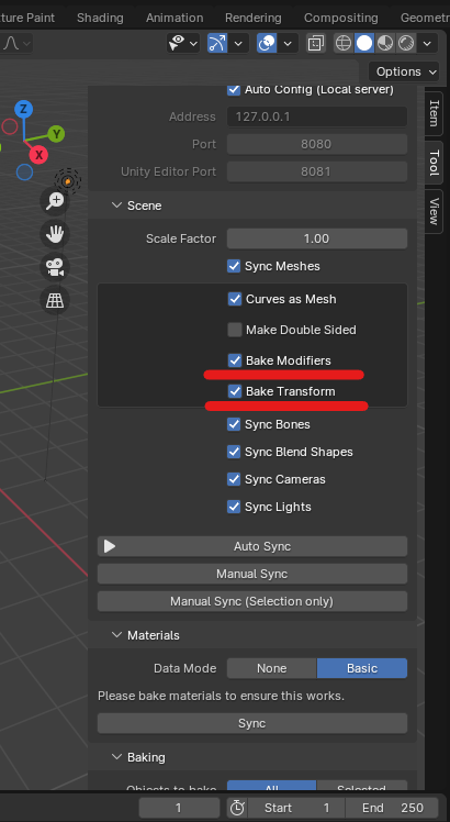 블렌더 MeshSync에서 [Bake to individual materials]를 누르면 bake가 되어야 하고, material에 Sync를 누르면 메테리얼이 유니티에도 적용되어야 한다. 되지 않음... 추가 연구 필요ㅠㅠ (유니티 버전 또는 블렌더 버전에 따른 오류 가능성)