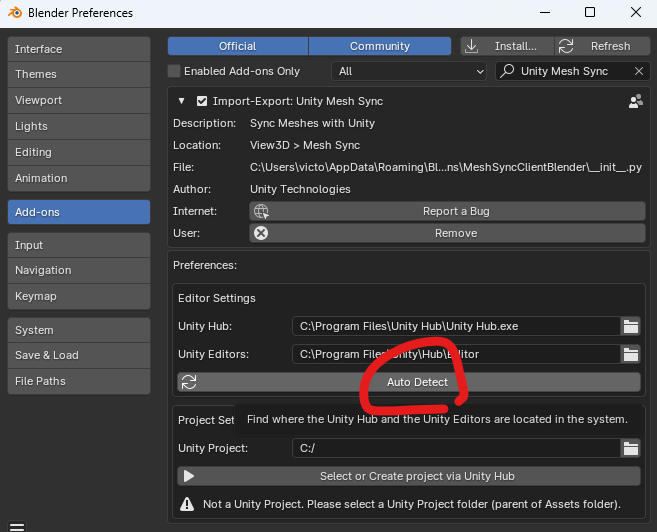 다시 Blender Preferences에서 애드온 설정에서 [Auto Detect]를 눌러 에디터를 찾는다.