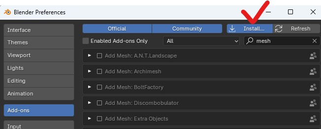 [Preferences] - [Install...] 버튼 클릭, 저장해놓은 blender-3.4.0.zip 선택