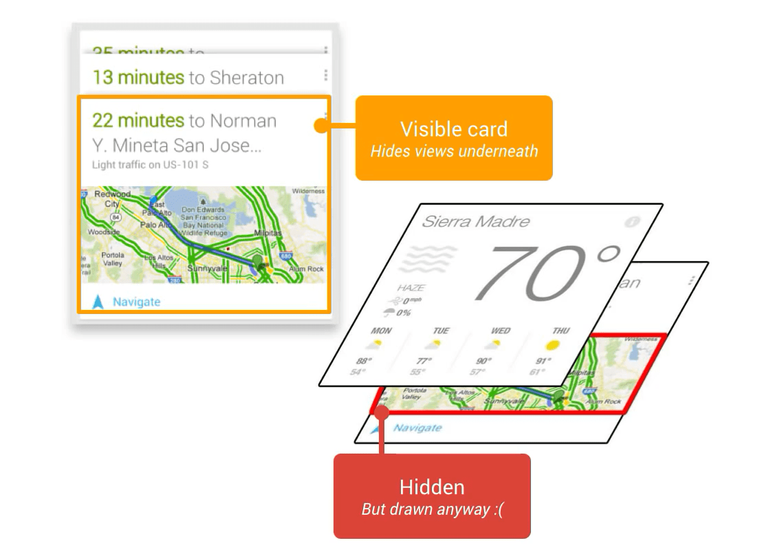 -Painter's Algorithm에 따라서 뒤에서부터 앞으로 렌더링이 되는데, 예를 들면 겹쳐있는 카드의 렌더링에서 불필요하게 뒤에 있는 부분도 매 프레임마다 렌더링 될 수 있다.