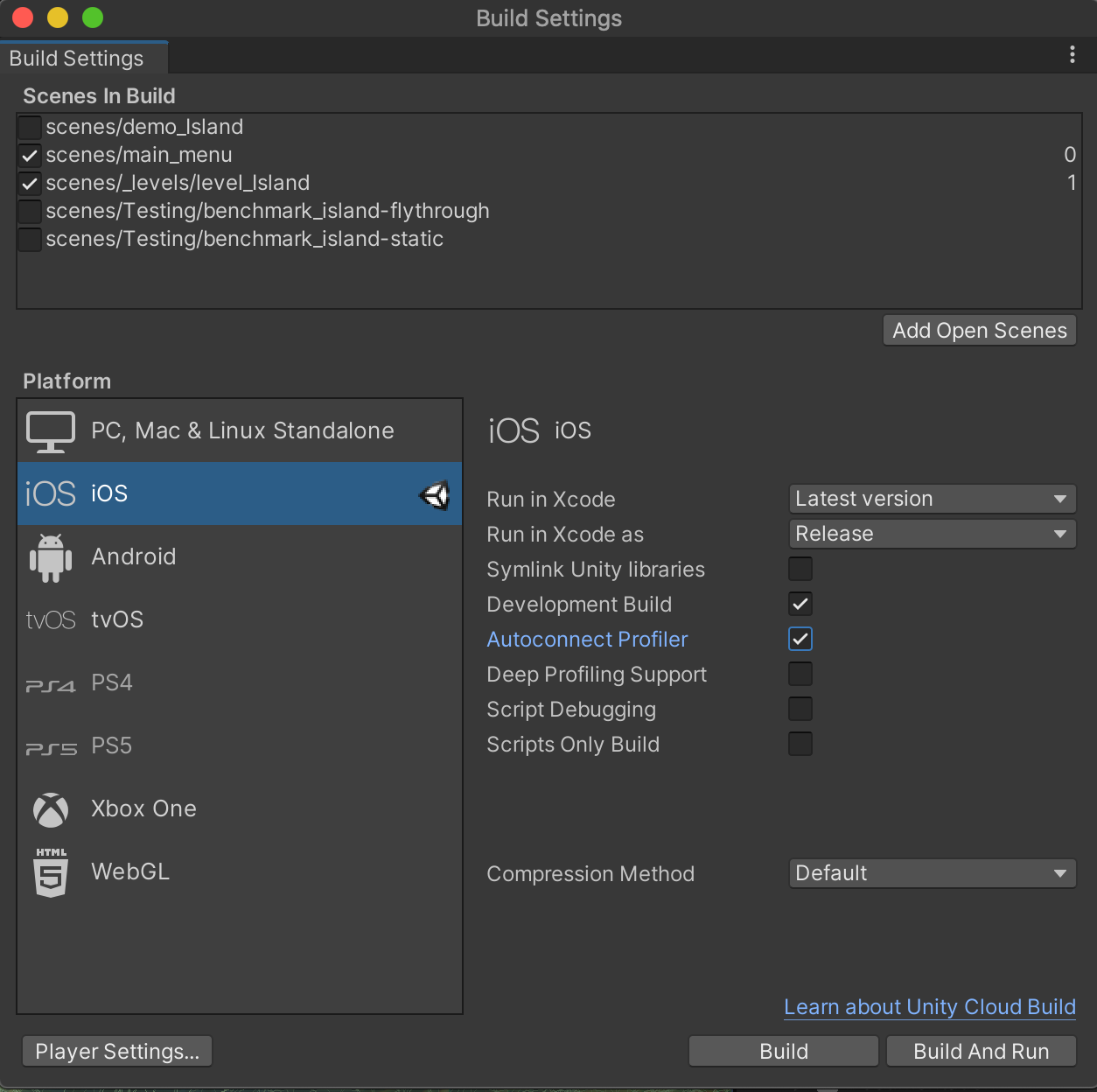- 어플리케이션 빌드에서, Development Build를 선택하고 Autoconnect Profiler를 선택하여 프로파일링 한다.