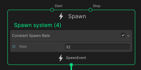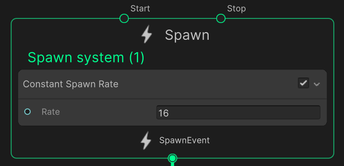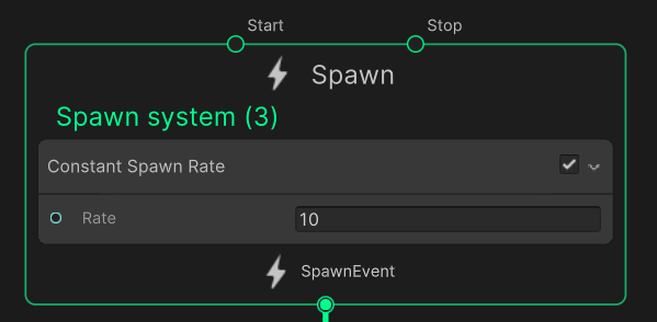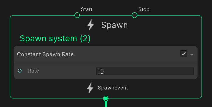 해당 시스템의 가장 상단을 보면 Spawn으로, 해당 효과를 생성하는 데에 전체적인 설정을 할 수 있다. 기본적으로는 [Spawn Rate]으로 생성 비율을 설정할 수 있다. 숫자가 크면 더 많이 생성된다.