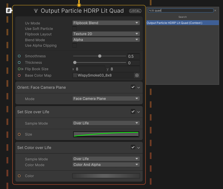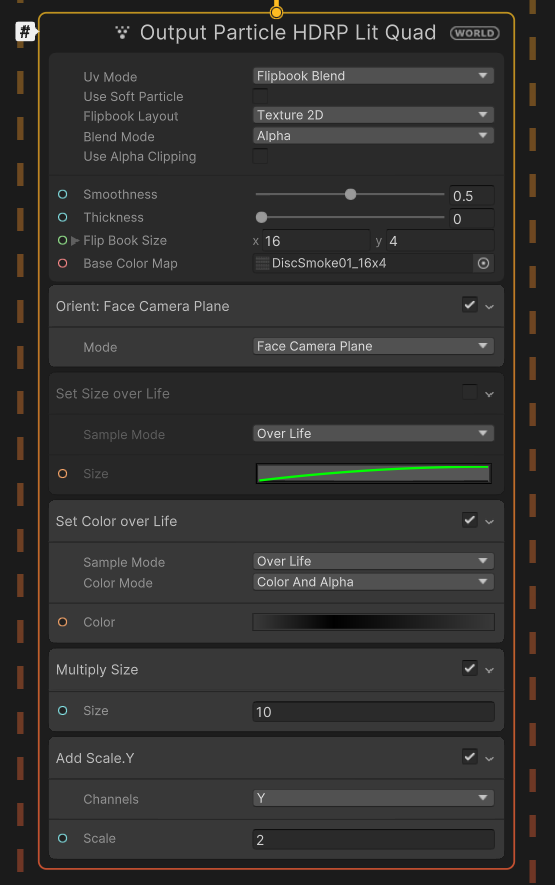 Output Particle Lit Quad를 따로 생성해서 Output에 적용하였다. Lit Quad로 빛에 영향을 받는 연기를 만들어서 올라가는 중에 불꽃에 가까울 수록 밝고 멀어질 수록 어둡게 표현된다.