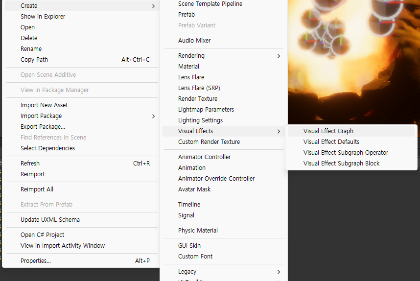 설치를 했다면 프로젝트 창에서 [Creat] - [Visual Effects] - [Visual Effect Graph]를 선택하여 VFX를 생성한다.