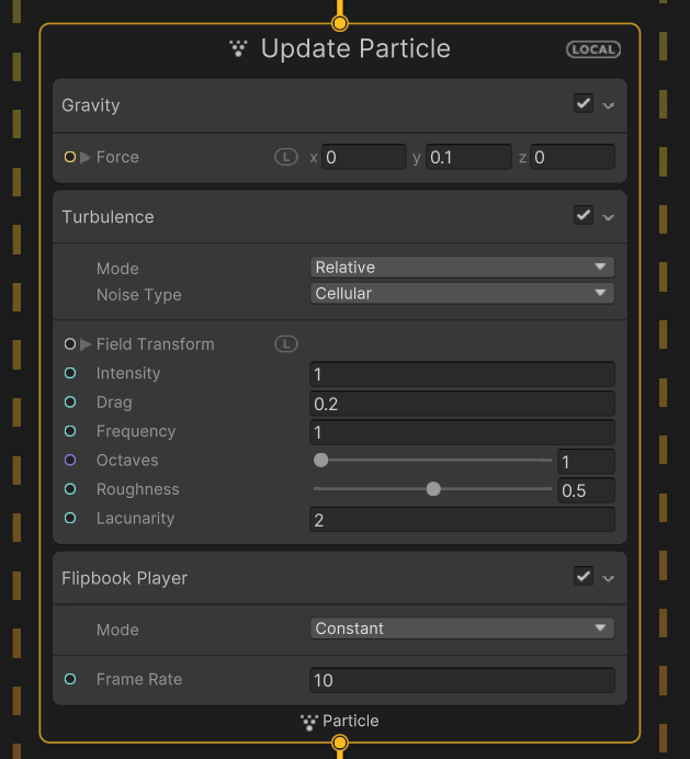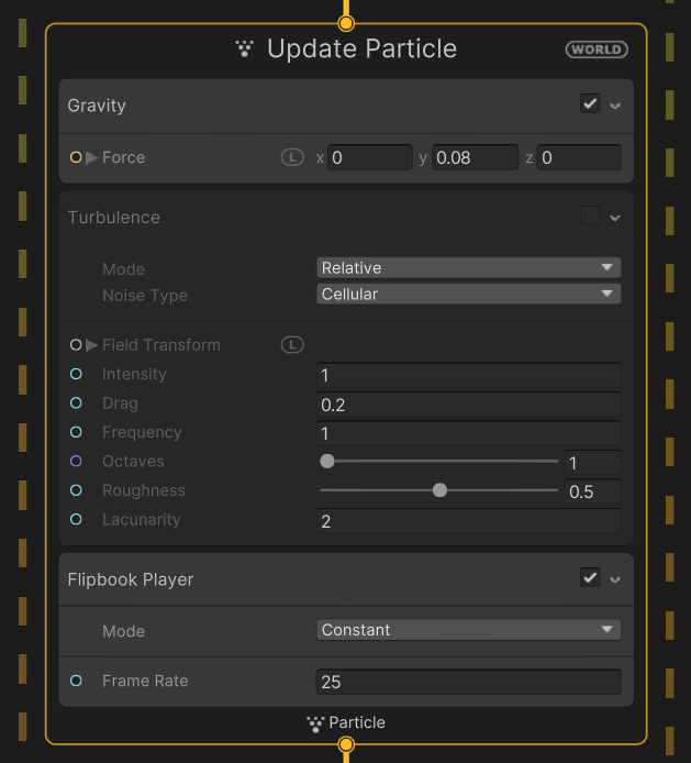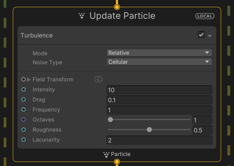 Update Particle에서 [Turbulence] 노드를 통해서 파티클에 말 그대로 난기류 값을 줄 수 있다. Intensity를 통해서 얼마나 강하게, Drag를 통해서 얼마나 마찰을 줄 것인지, Frequency를 통해서 얼마나 자주 부여할 것인지를 설정할 수 있다.