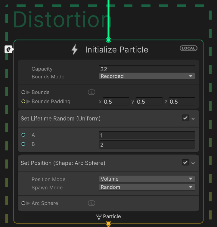 Output에는 기존의 것 말고 Distortion Quad를 따로 생성해서 붙였다. 우리가 3D Mesh를 쓰는 것은 아니기 때문에 텍스쳐를 이용하는 [Output Particle Distortion Quad]를 사용했다.