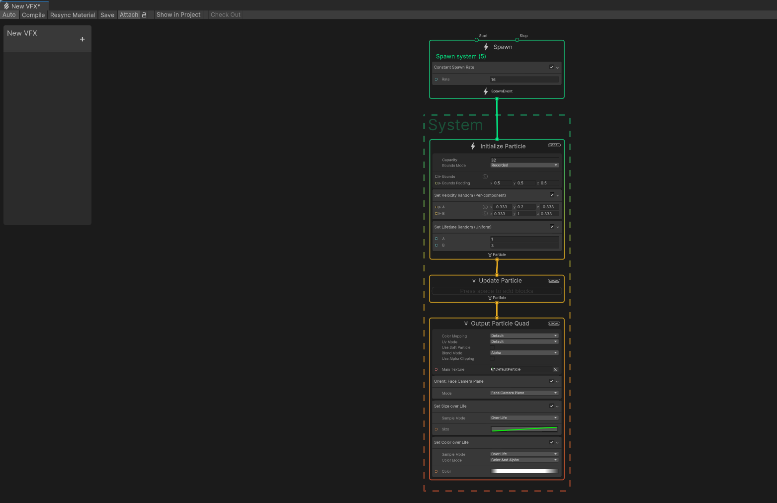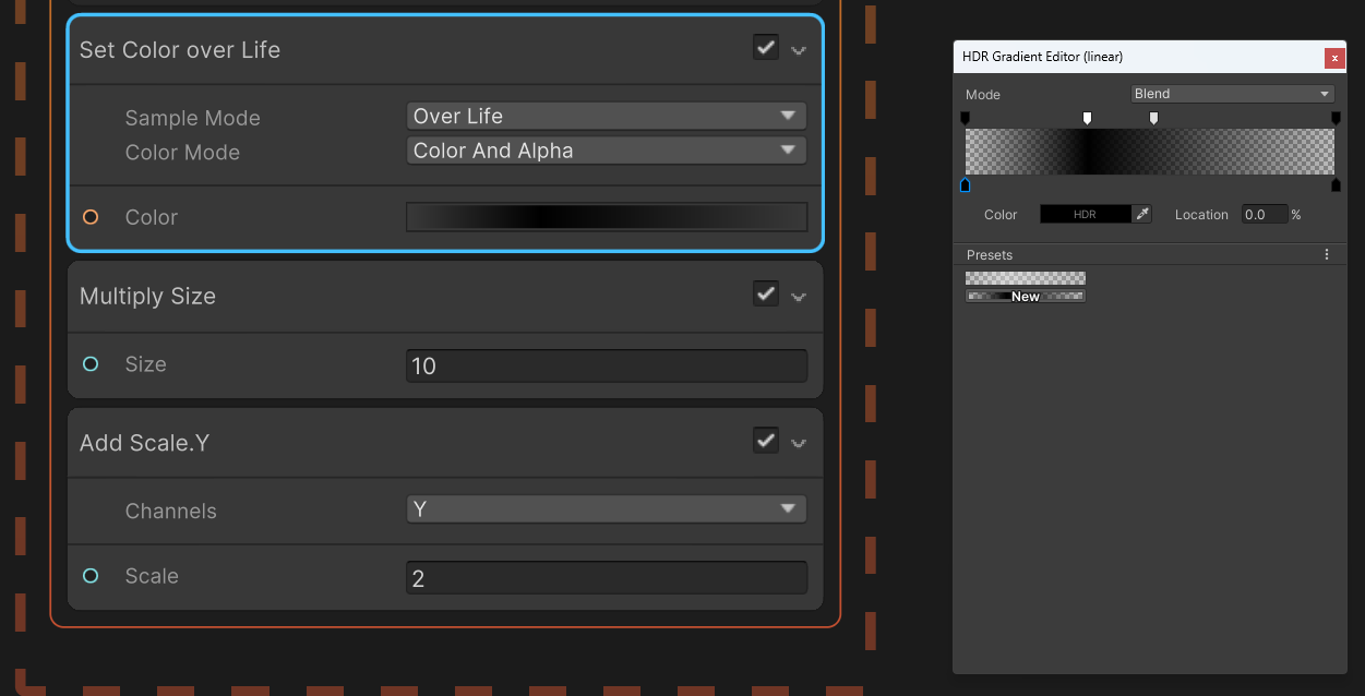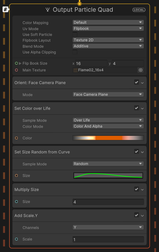 기본적으로 [Face Camera Plane], [Set Size over Life], [Set Color over Life] 노드가 포함되어 있다.