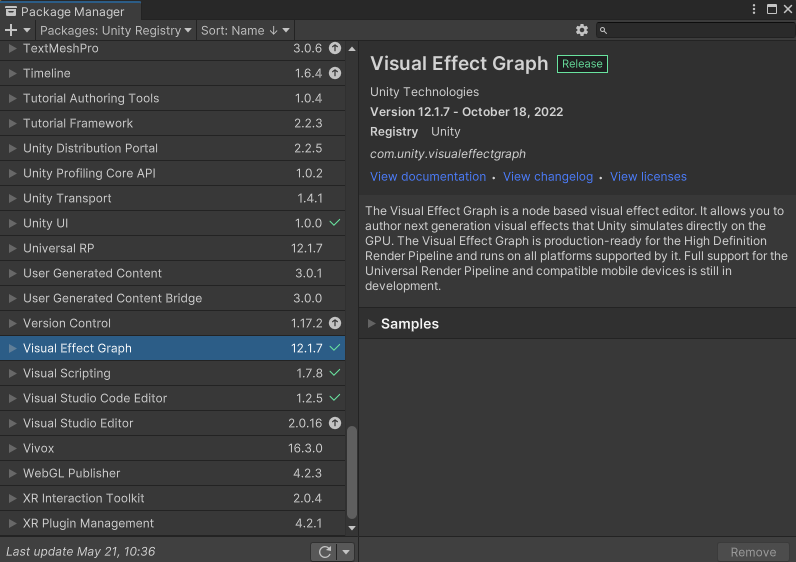먼저, VFX를 만들기 위해서는 Package Manager에서 Visual Effect Graph를 설치해야 한다.