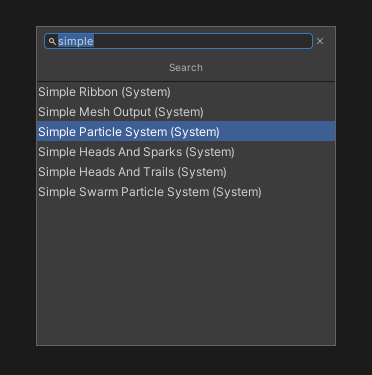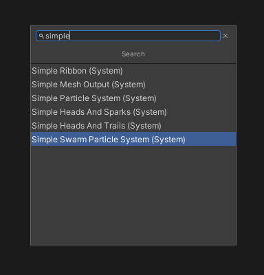 나무가 타는 모습을 보면 단순히 불꽃만 생기지는 않는다. 나무가 타닥 타닥 타면서 스파크를 간간히 만들어 낸다. 해당 부분 또한 새로운 Spawn System으로 만든다. 빈 공간에 스페이스 바를 누른 후 "simple"을 검색하여 [Simple Swarm Particle System]을 생성한다.
