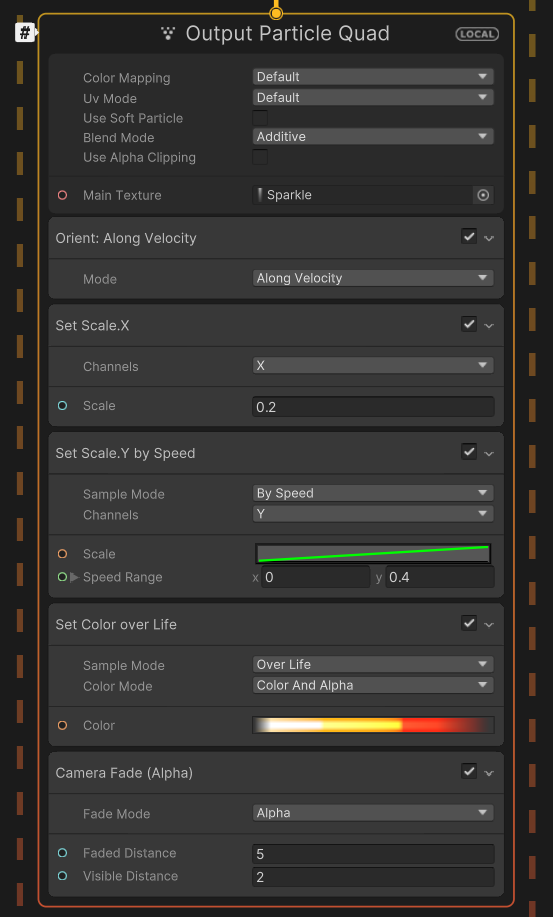 [Camera Fade] 노드를 이용해서 카메라 거리에 따라 해당 파티클이 보여질지 아닐지를 설정했다. 이 부분은 최적화와도 관련이 있다.