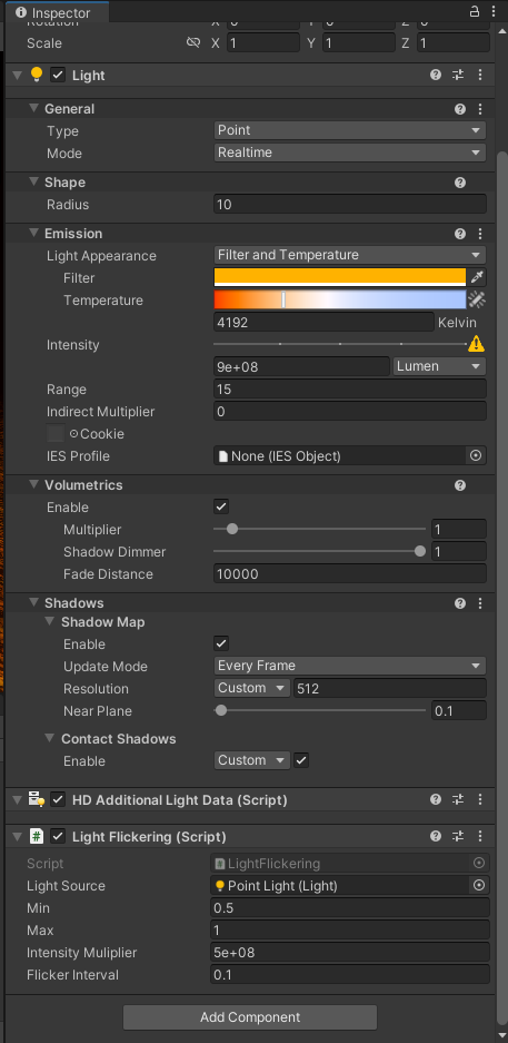 그리고 깜빡이는 효과를 위해서 LightFlickering 스크립트를 생성하여 적용하였다.
