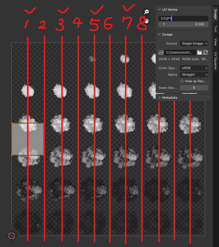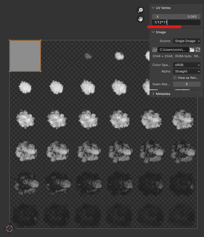 단축키 N을 눌러서 사이드 메뉴 중 [Image] 메뉴에서 X의 값을 가장 왼쪽으로 가져오기 위해서 1/12*1 계산식을 이용하였다. 가로로 총 12조각을 눌러서 첫 번째 라인에 UV의 센터가 와야 하기 때문이다.
